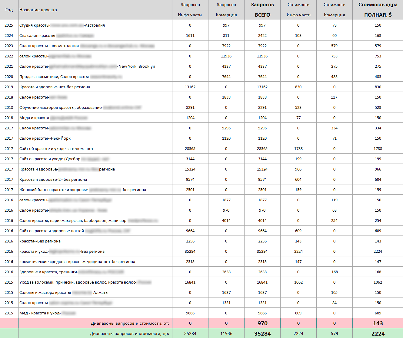 С 2015 года мы собрали 29 семантических ядер для индустрии красоты в 11 регионах. Наша экспертиза включает составление семантики по косметологии и уходу за волосами, продаже косметики и парфюмерии, маникюру и педикюру. Мы собирали ключевые слова для массажа и СПА-процедур, перманентного макияжа и татуажа, наращивания ресниц и бровей. Дополнительно охватили эпиляцию и депиляцию, пилинги и чистку лица, солярий и загар, свадебные прически и макияж. Бюджеты проектов составляли от 143 до 2224 долларов. Такой подход обеспечивает полное покрытие бьюти-индустрии и максимальную клиентскую базу для вашего салона красоты.