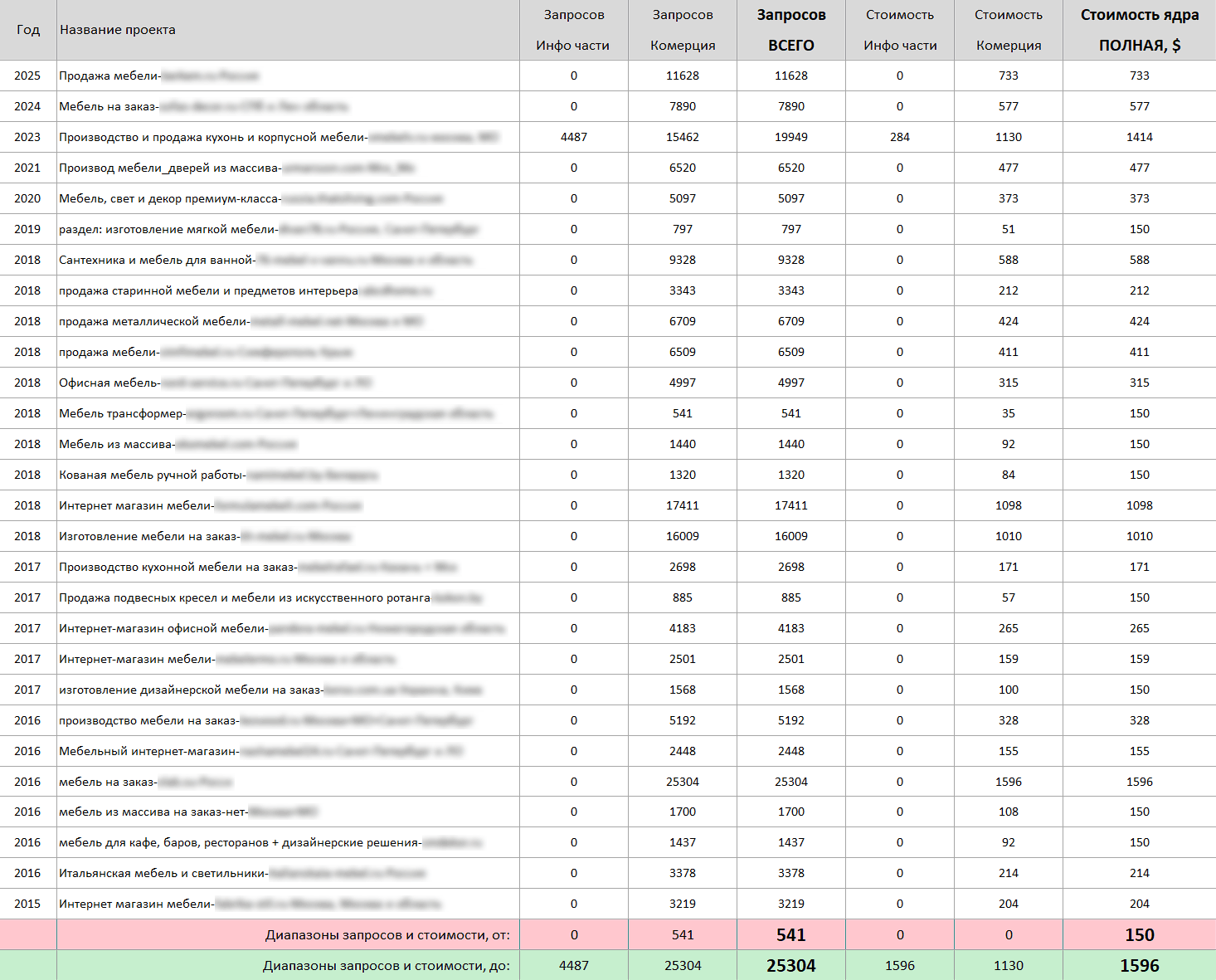 С 2015 года мы собрали 40 семантических ядер для мебельных интернет магазинов в 24 регионах. Наша экспертиза включает составление семантики по продаже мебели для ванной и кухни, прихожей и спальни, офисной и детской мебели. Мы собирали ключевые слова для мебели из массива и МДФ, кованой и дизайнерской мебели, мягкой мебели и матрасов, шкафов-купе и встроенной мебели. Дополнительно парсили поисковіе запросы и охватили: столы и стулья, диваны и кресла, комоды и тумбы, стеллажи и полки, корпусную мебель на заказ. Бюджеты проектов составляли от 150 до 1596 долларов. Такой подход обеспечивает максимальный охват мебельной индустрии и высокие продажи для вашего магазина.